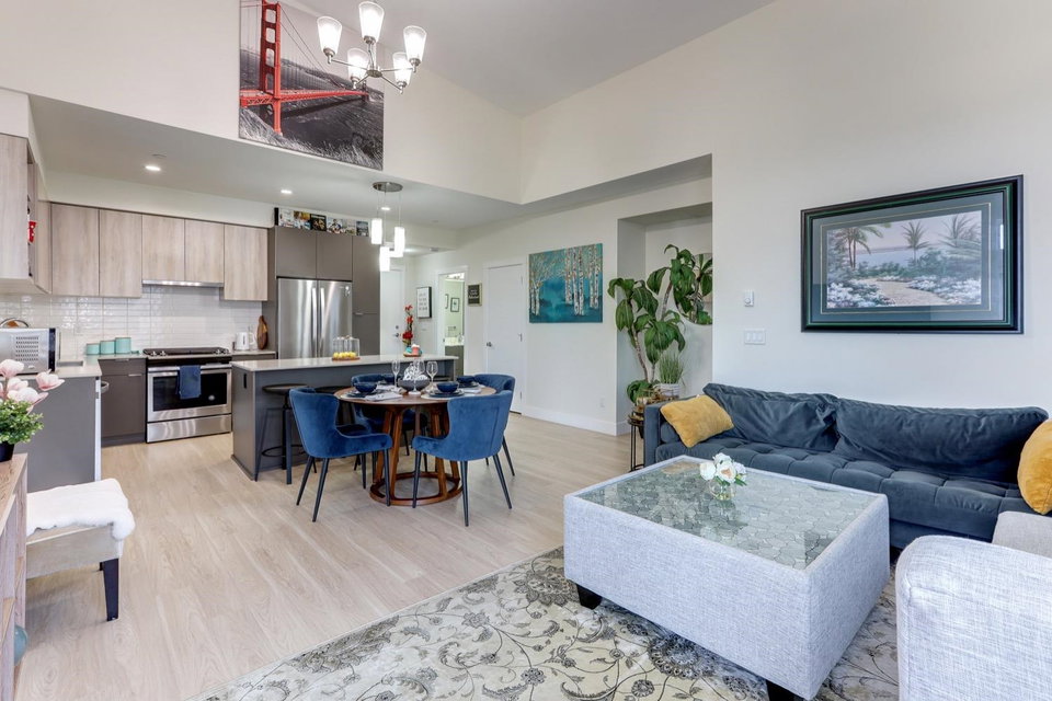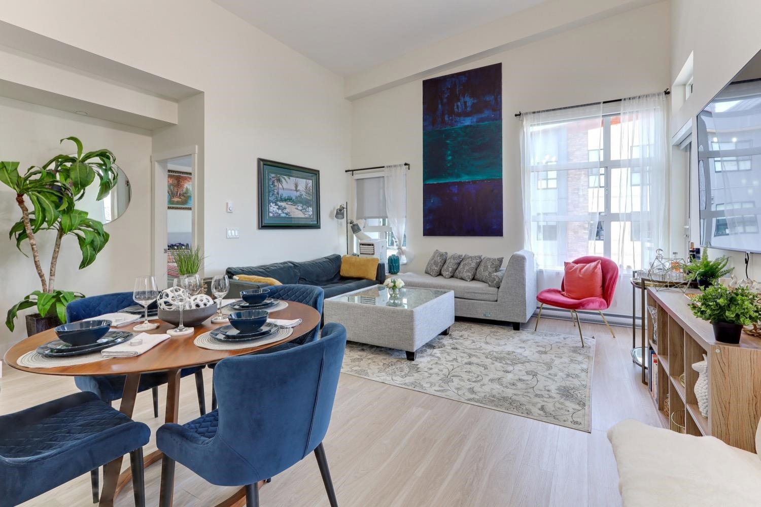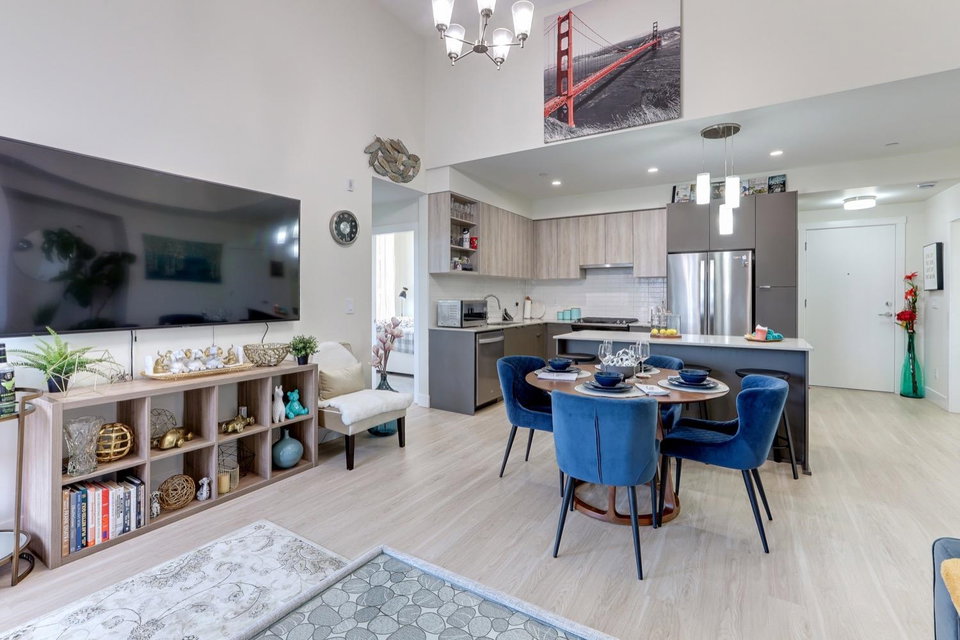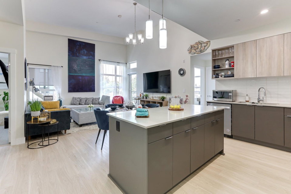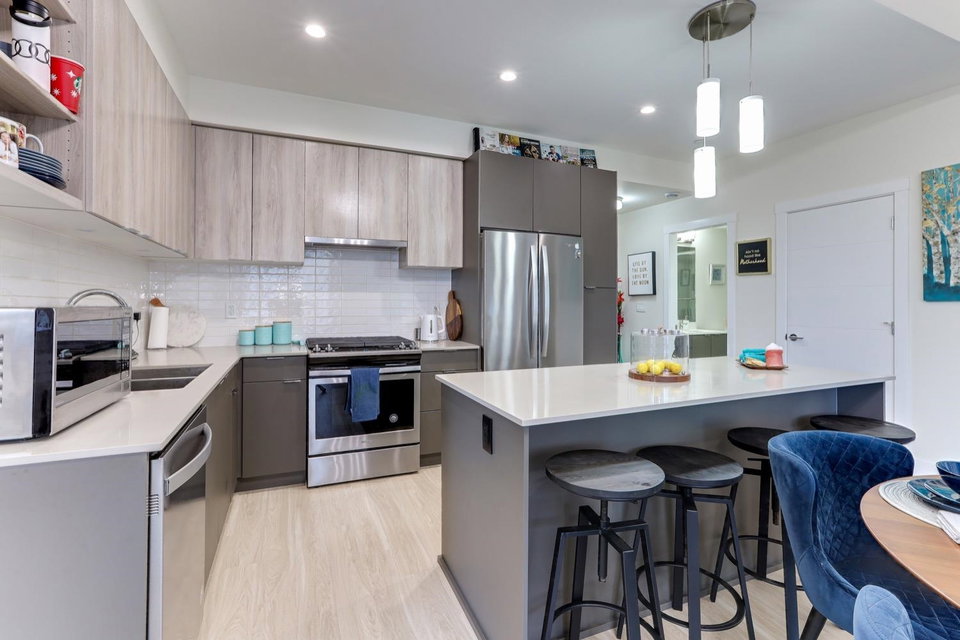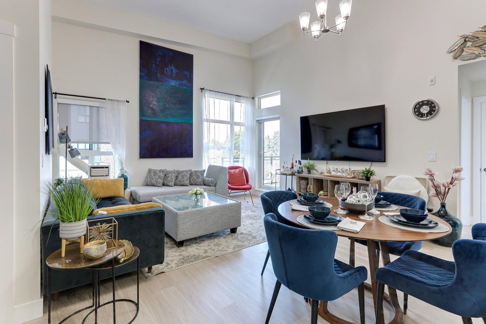 Welcome to Scott & Nicholson in SUNSHINE HILLS. Corner unit with a bright open floor plan with plenty of large window offering lots of natural light. This beautiful North facing, top floor corner unit offers 3 bed, 2 bath home boasts a living room and large master bedroom with 14′ foot ceilings. Walking distance to grocery stores, restaurants, shopping, and plenty of natural parks and green spaces. 12,000 sqft amenities include outdoor lounging areas with gas fire pits, gas bbq, bocce court and ping pong table. You will have access to the fitness room, fully equipped kitchen and entertaining area for large parties. Enjoy the mountain view from the living room and 2 bedrooms. Huge wrap around balcony with gas hookup for your summer BBQs, comes with 1 parking and a storage locker.